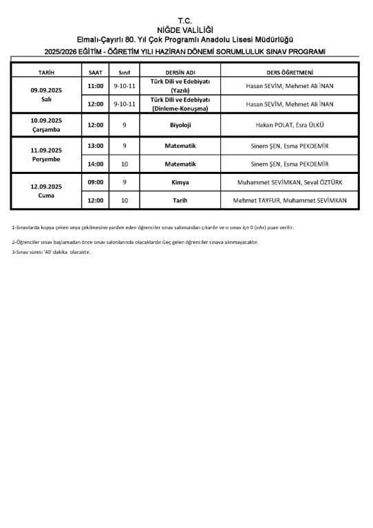 2025/2026 EĞİTİM- ÖĞRETİM YILI HAZİRAN DÖNEMİ SORUMLULUK SINAV PROGRAMI